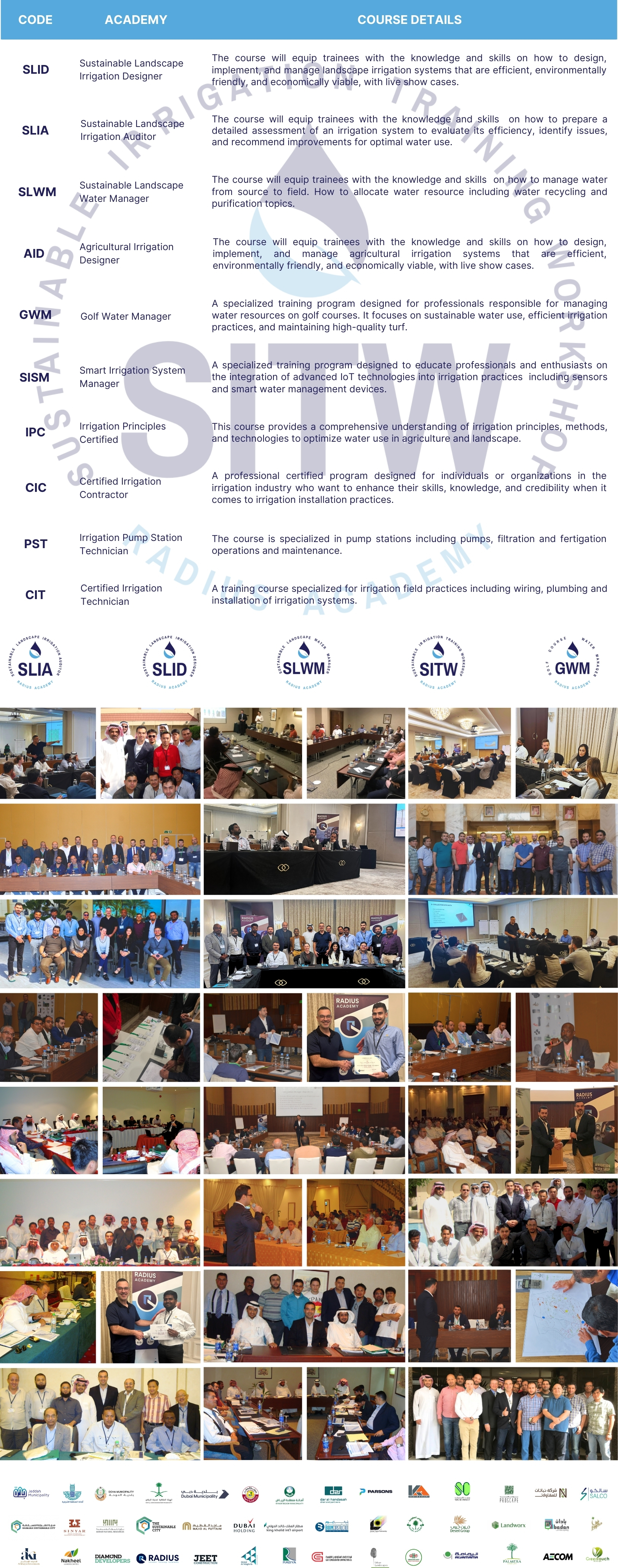 Established in 2010, RADIUS Academy’s Sustainable Irrigation Training Workshop (SITW) has become a premier training program for professionals across the Middle East seeking to enhance their expertise in irrigation practices and water management. The program aligns seamlessly with RADIUS Academy’s strategy and commitment to promoting water sustainability in the Arabian Gulf and the broader Middle East region.